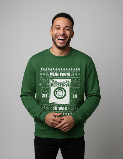 Verwelkom de kerstsfeer met onze Kersttrui In De Was kersttrui een hilarische, dubbelzinnige toevoeging aan jouw kerstoutfit. De opdruk toont een wasmachine met een trui erin, met daarop de tekst “Mijn Foute Kersttrui Zit in de Was”, omringd door speelse sneeuwvlokken, zeepbellen en vrolijke rendieren.