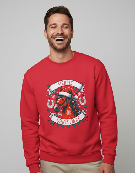 Laat je passie voor paarden stralen tijdens de feestdagen met onze unieke Merrie Christmas kersttrui! Deze trui is niet alleen een eerbetoon aan het kerstseizoen, maar ook een ode aan jouw liefde voor paarden op een speelse en stijlvolle manier.