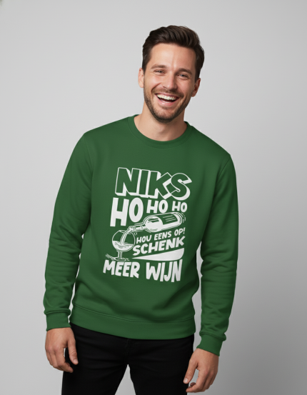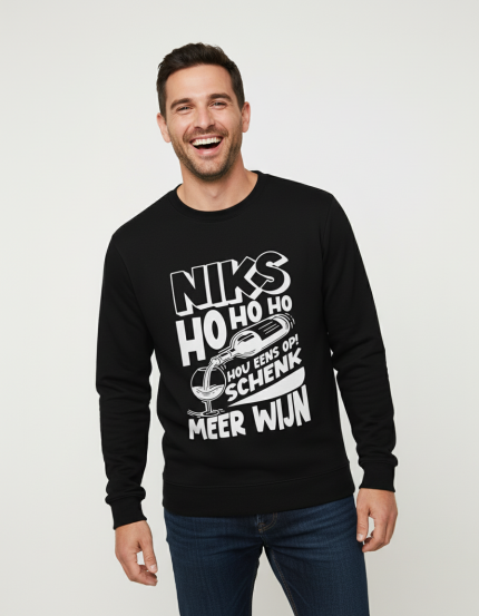 Deze feestelijke trui viert alle momenten van gezelligheid, ongeacht de gelegenheid. Met de tekst Niks HO HO HO, Hou Eens Op, Schenk Meer Wijn en een afbeelding van een wijnfles die gul in een wijnglas wordt geschonken, brengt deze trui een speelse knipoog naar de feestdagen. Of het nu kerst, oud en nieuw, een verjaardag of gewoon een gezellig samenzijn is, deze trui is de perfecte metgezel voor iedereen die liever wijn hoort vloeien dan het geklets van je buurvrouw/buurman.